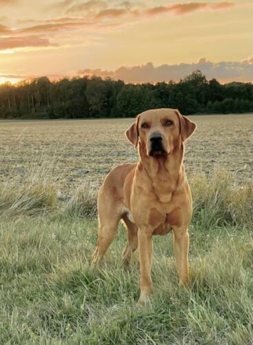 Till henne har vi valt Meadowlark Man O´War – en gul hane efter Blues syster Meadowlark Sussex Charmer och Silvafern Dark Night, aka Chap. Tage som han kallas till vardags är en riktig pärla, husse Mattias ögonsten. Tar sin an allting med största naturlighet. Trygg, lugn och säker. Tage har en SSRK-start med excellent i NBKL, men har riktiga jaktmeriter ute i verkligheten, som apportör.